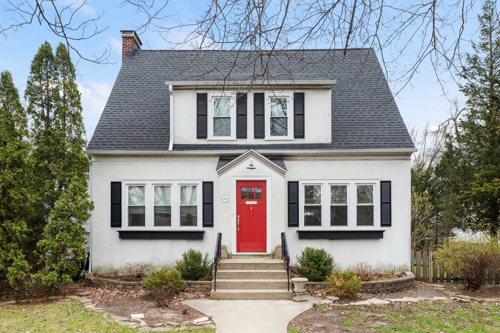 Choose from a Wide Selection of Interior Exterior and Interior Paints. White House with Black Shutters and Red Door Gray House lining Brick Style.